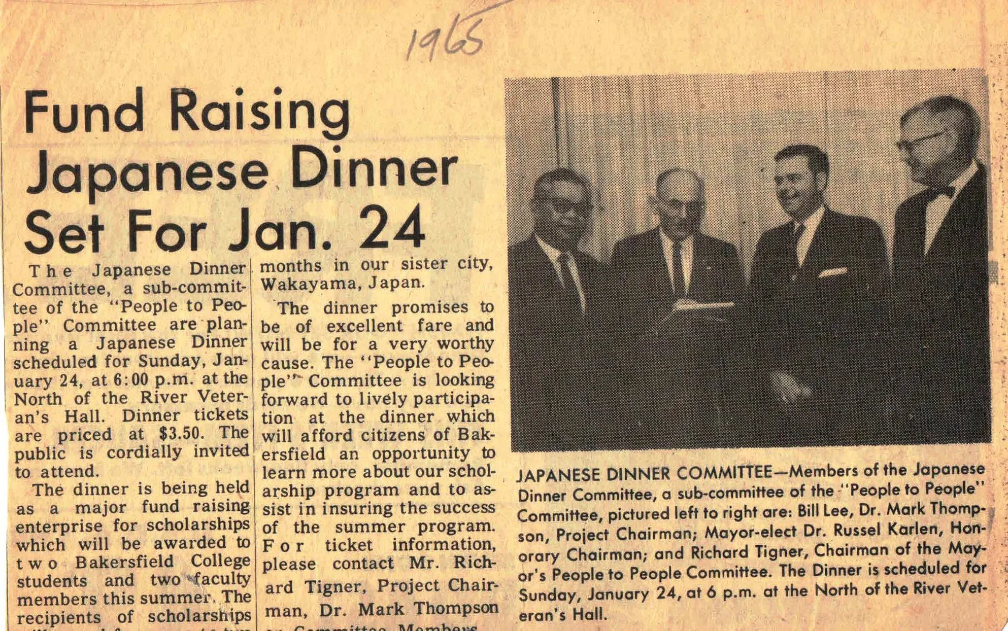 Bakersfield’s affiliation with Wakayama, Japan officially began when the Bakersfield City Council adopted Resolution 81-61 on August 21, 1961, establishing a friendship with the City of Wakayama, Japan. This action was shortly followed by Bakersfield Mayor Gene Winer appointing a People-to-People Steering Committee to oversee the Bakersfield-Wakayama Sister City relationship. Later, the Bakersfield Sister City Project Corporation was created. Very soon Bakersfield officials and citizens were traveling to our new Sister City, where they were overwhelmed by the friendly reception. In return, delegations from Wakayama began to visit Bakersfield, forming lasting friendships that continue to the present day.